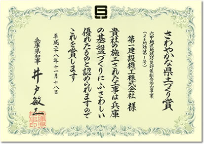 「六甲地区地域防災対策総合治山事業」工事にて 兵庫県より “さわやかな県土づくり賞”を受賞 |